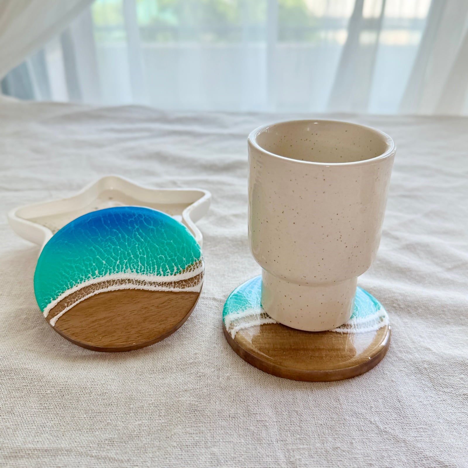 Each round coaster is handcrafted from natural acacia wood and topped with a smooth layer of non-toxic epoxy resin, forming vivid ocean wave patterns that capture the serene beauty of the shoreline. Designed to be both decorative and functional, these coasters protect your surfaces from moisture while adding a touch of coastal elegance to your home.